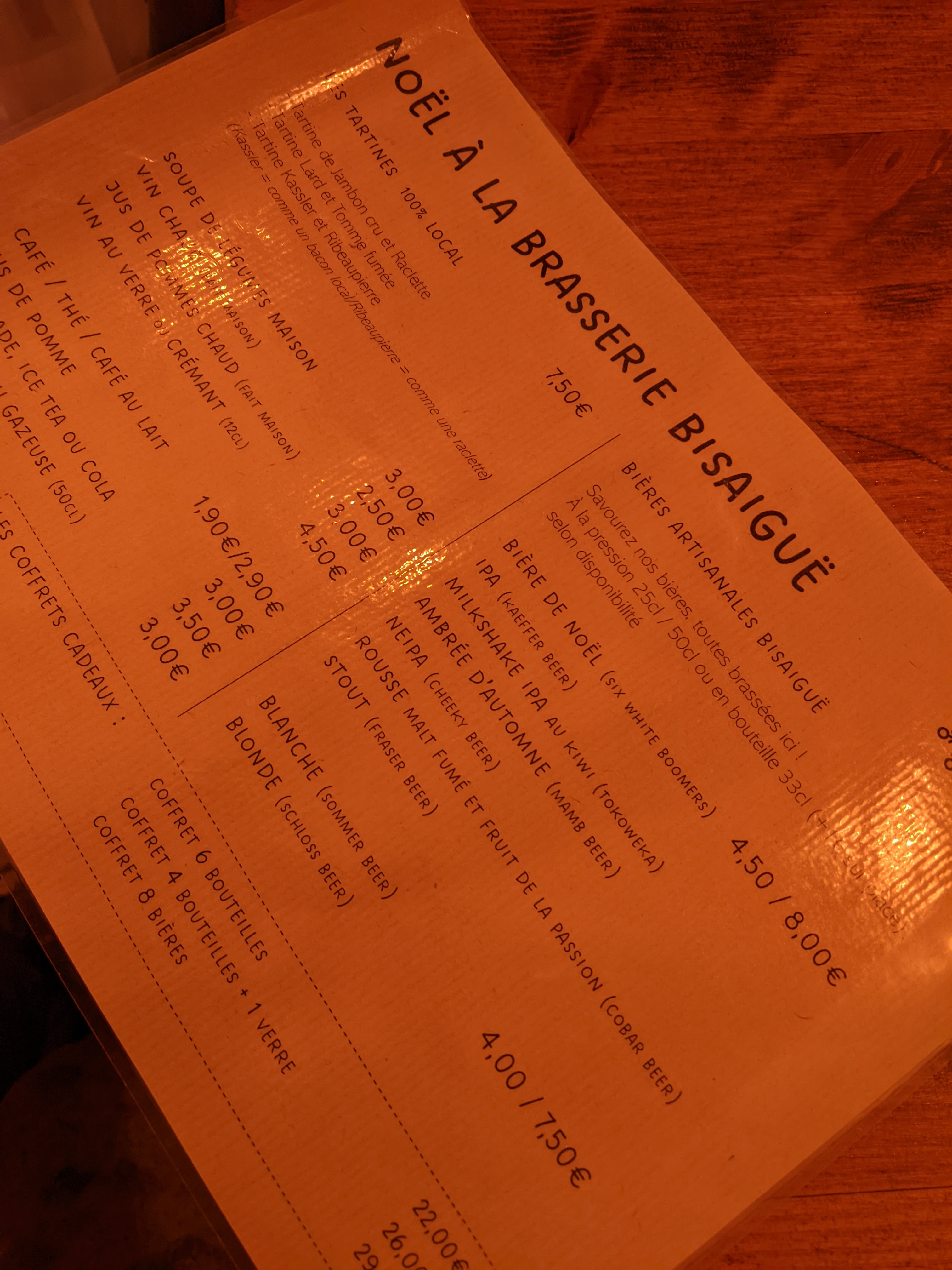 Posté le 07/12/2023 à 09:03"Un incontournable ! Très jolie salle, prix correct pour la ville, et surtout très bon accueil et service! Depuis la rue, je pensais qu'ils ne proposaient que des bières... mais non! Vin chaud, jus de pomme chaud, café, thé, quelques boissons fraîches. Peut être une suggestion : chocolat chaud et des bretzels?"